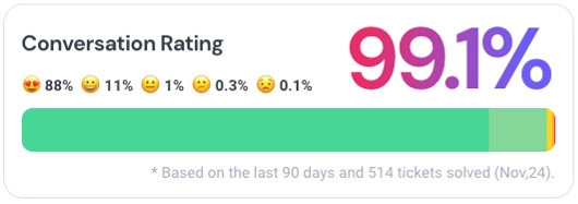 Our current first response time on live chat during work hours is 1:30 mins and 99.1%(!) support satisfaction rate.