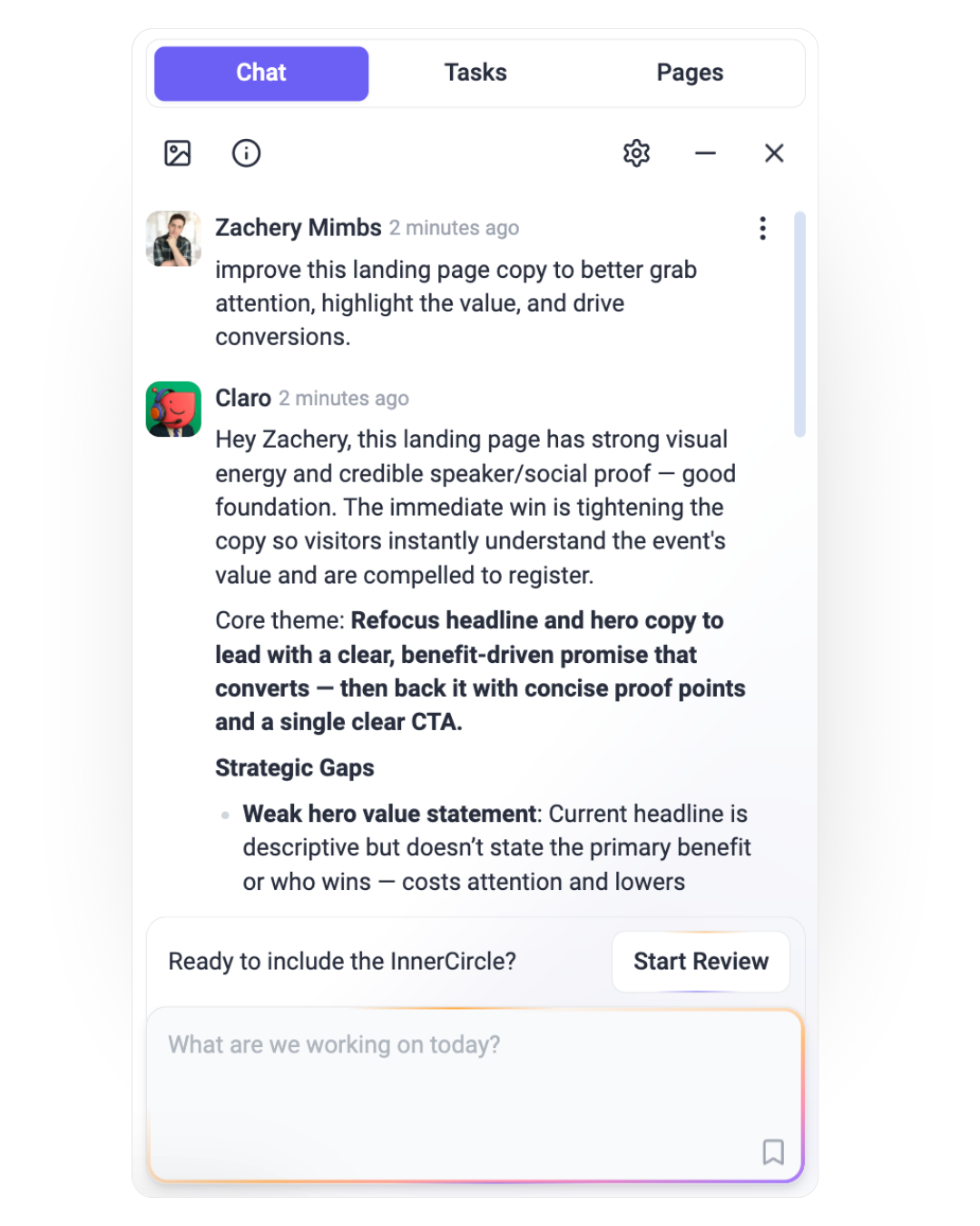 Claro translates “make it pop” into specific design, copy, and structure tasks — assigning them to Pixel, Lexi, or Navi.
