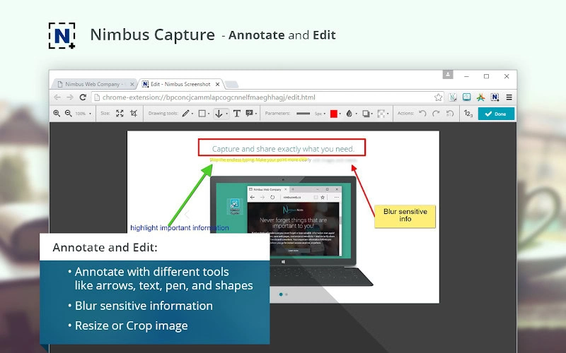 - Robust Editing Tools: Nimbus allows you to edit screenshots including annotating, cropping, and blurring sensitive information. These features are ideal for anyone looking to create tutorials, produce documentation, or provide feedback on digital projects.