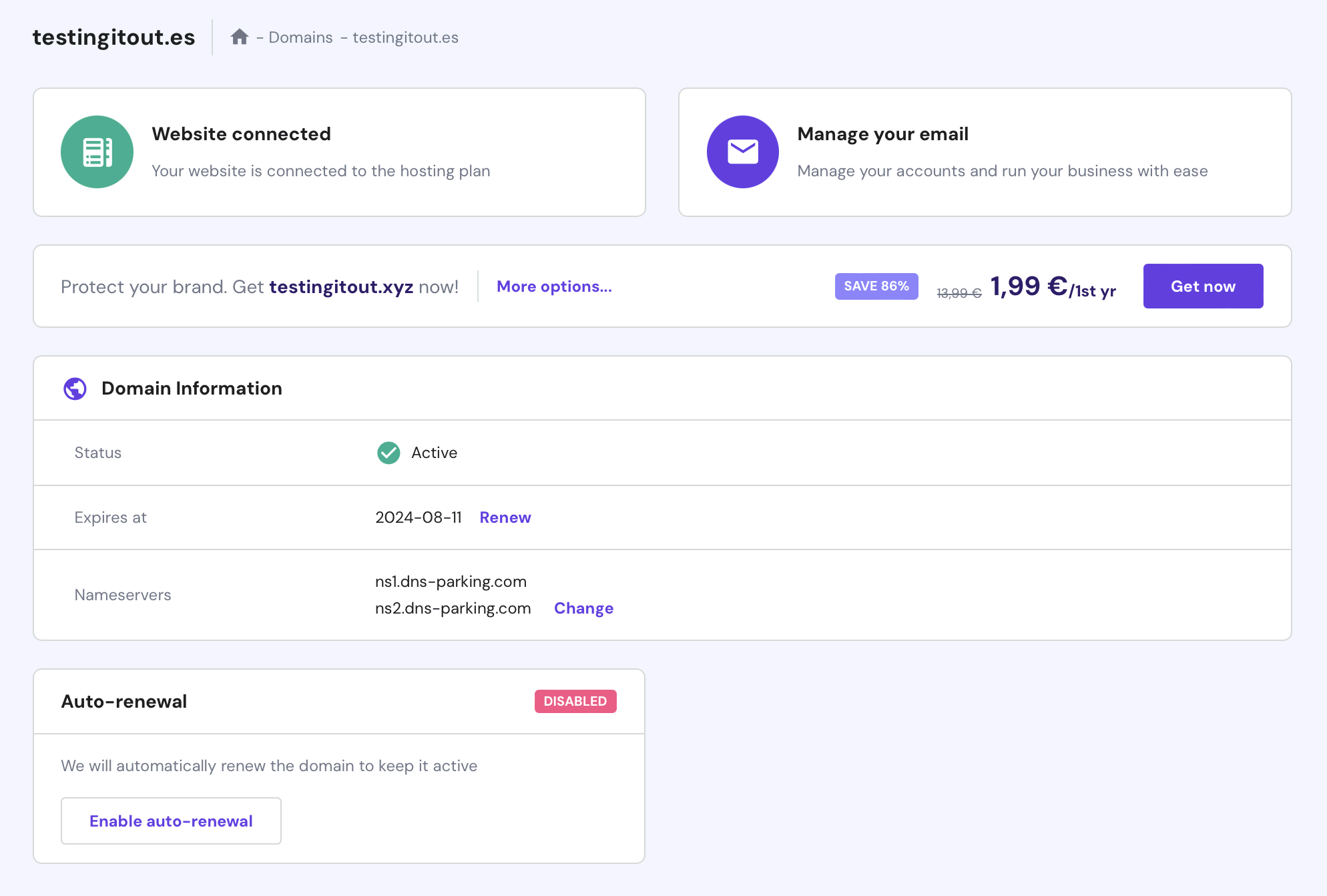 If you click on the ‘Manage’ button next to a specific client, you will see basic information about hosting, domain, and email.