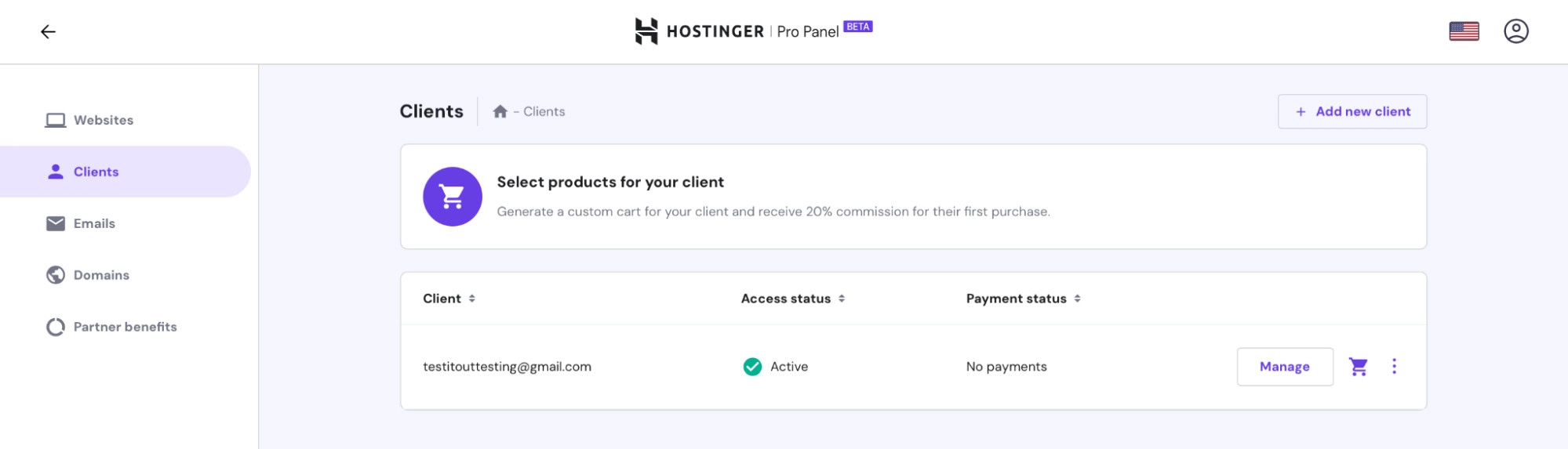 To add a new client, you just have to click on the ‘+ Add new client’ button and fill in the client’s email address, (note that each client has to have an active Hostinger account).