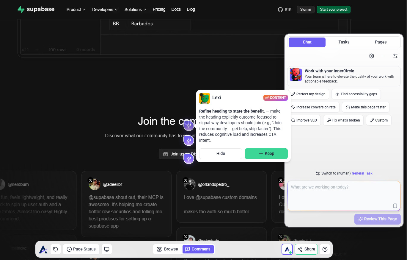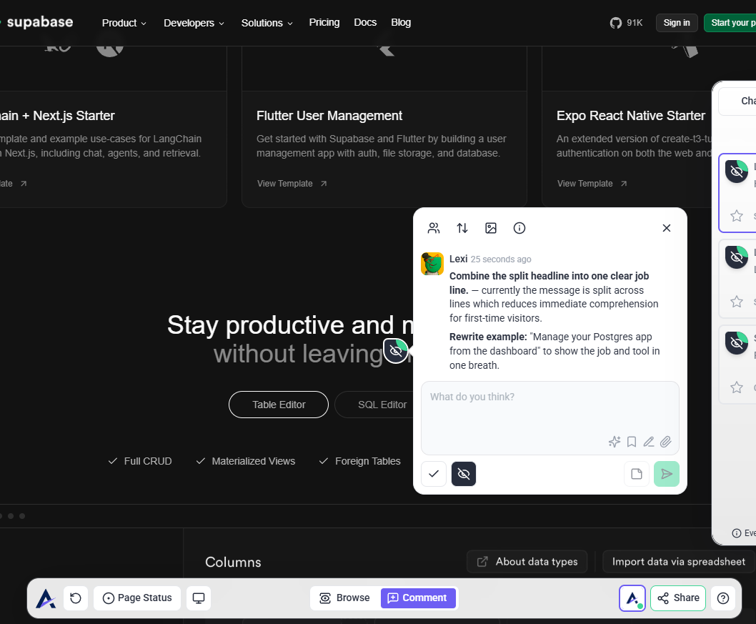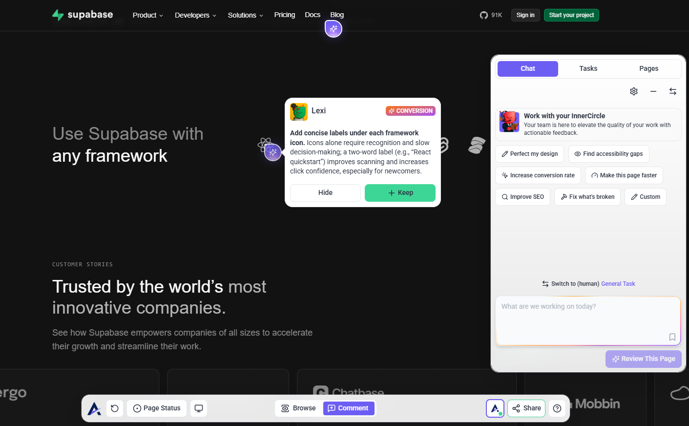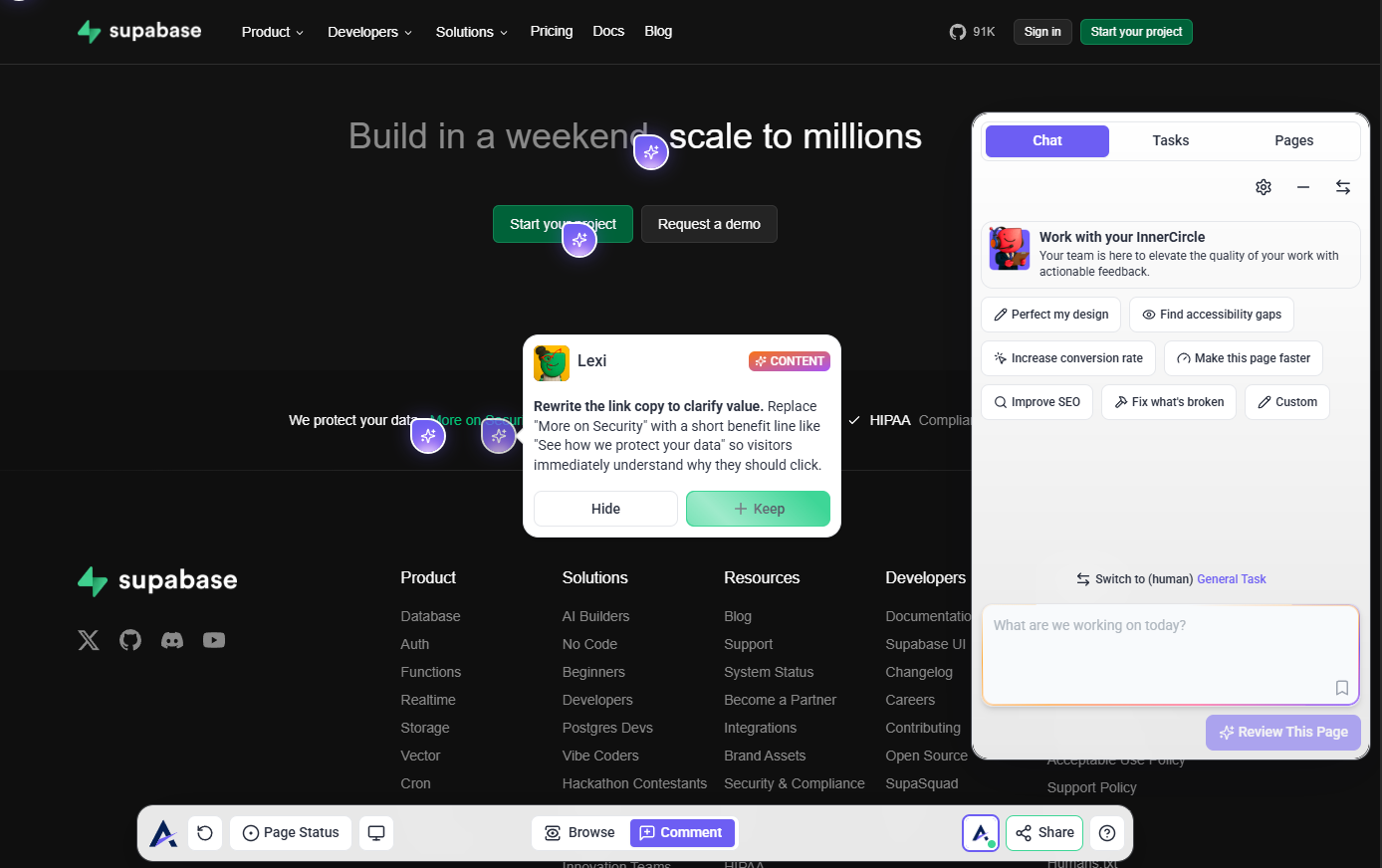 Lexi reviews every piece of visible text on the page — from buttons and labels to headlines and onboarding flows — with a focus on clarity, persuasiveness, and tone consistency. She checks whether copy communicates the message clearly, aligns with your brand’s voice, and guides users toward the intended action without confusion or friction.