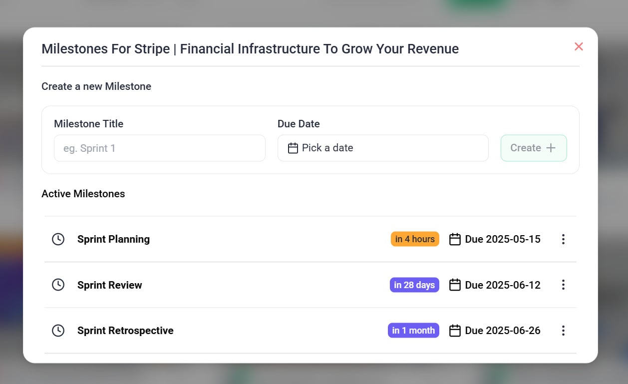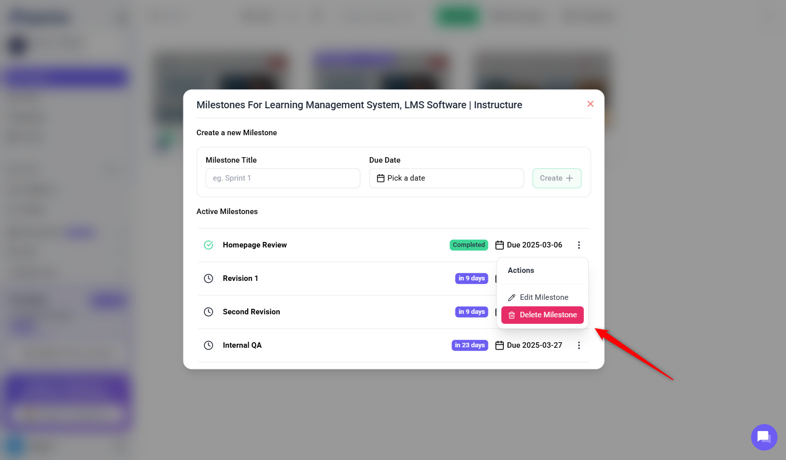 - Client View: Clients see pending milestones, and overdue ones turn red, prompting timely feedback.