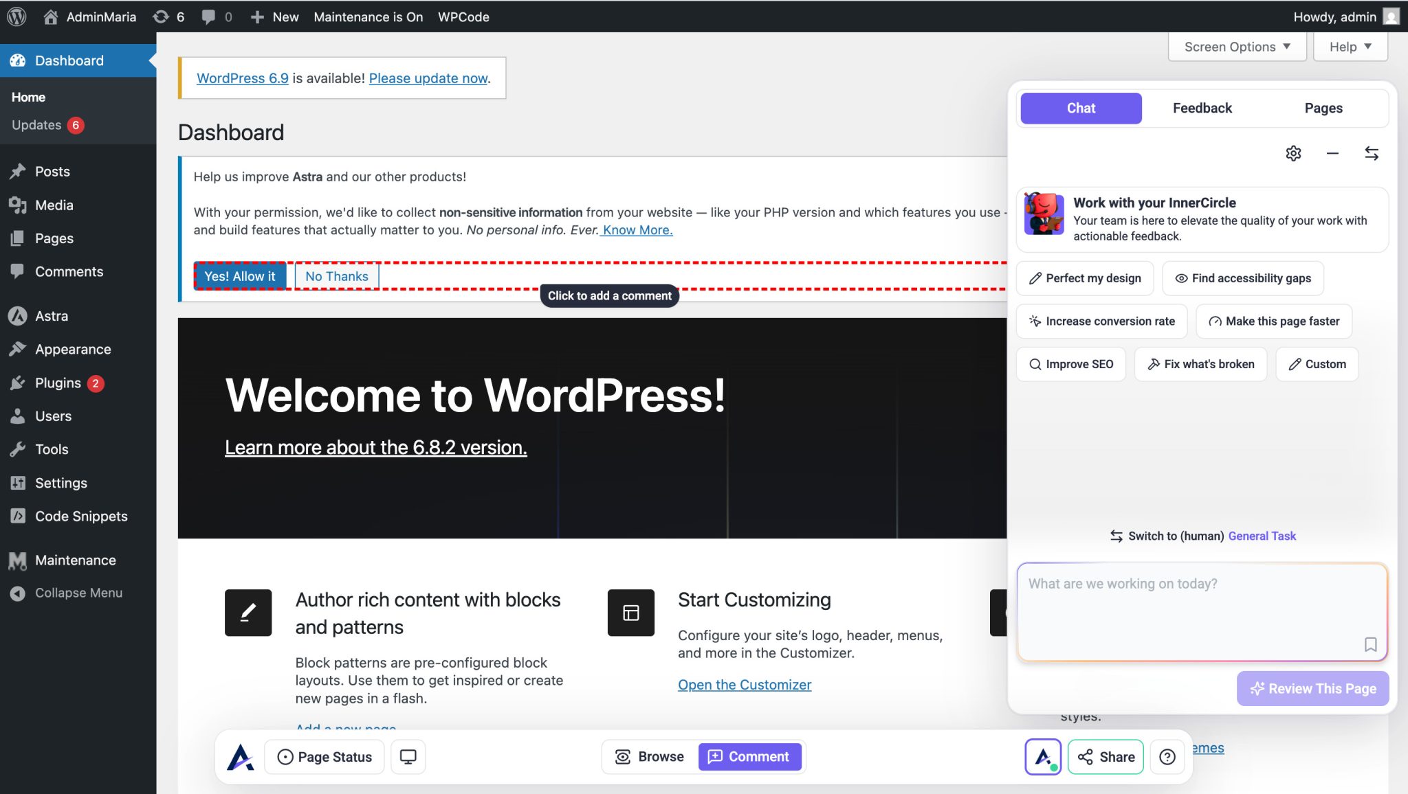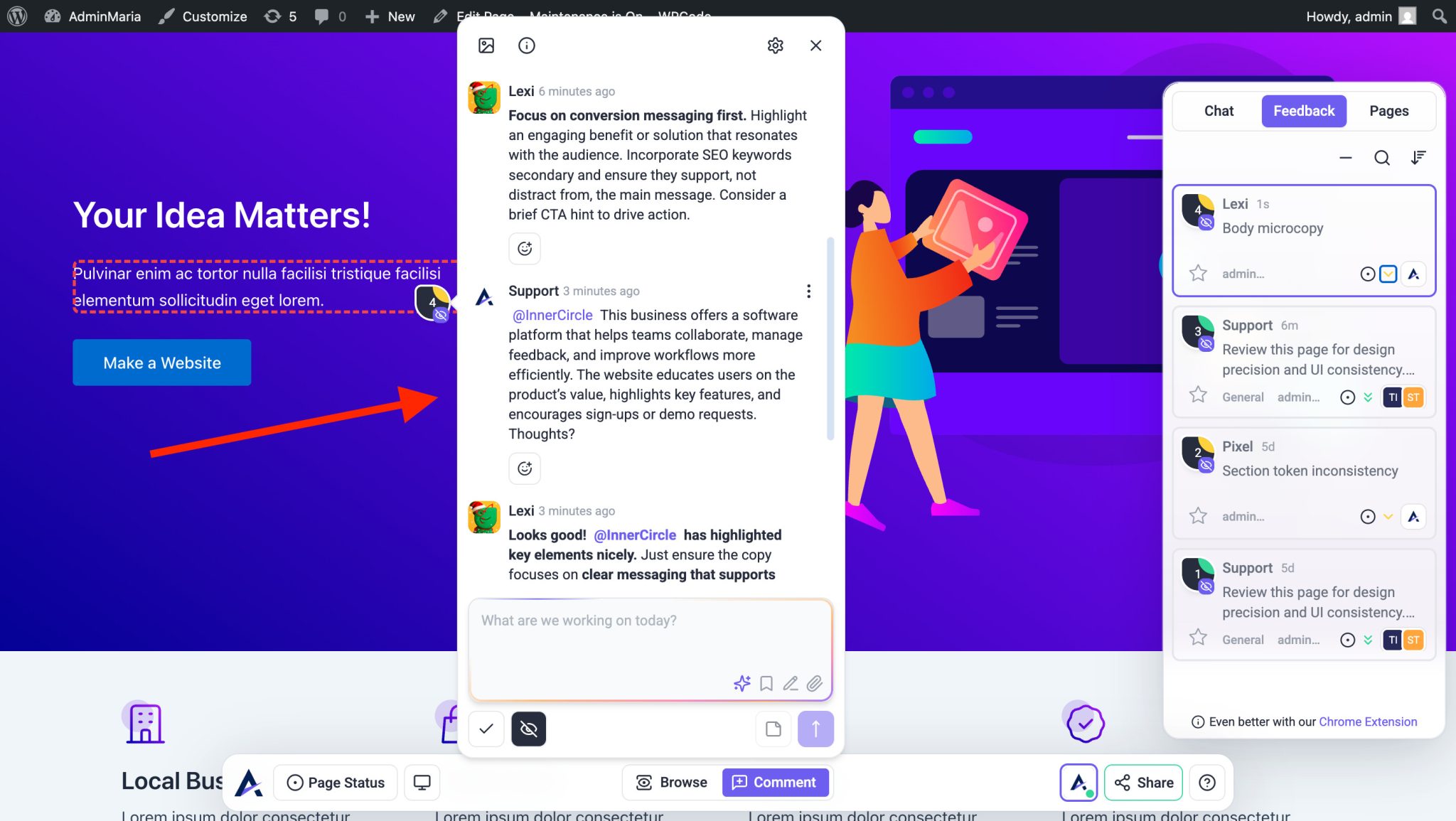 The plugin allows teams to collaborate visually directly on live WordPress pages and WP Admin screens. Users can leave feedback on page elements, create tasks, use AI for internal reviews, and manage collaboration without relying on screenshots or external tools.