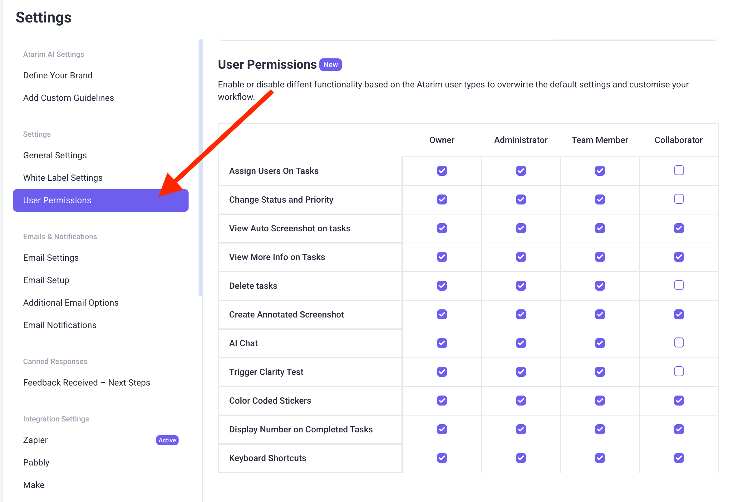 The Settings tab lets you configure settings that affect how Atarim interacts with all projects. You can manage general settings, use white label options to customize the interface, and set user permissions.