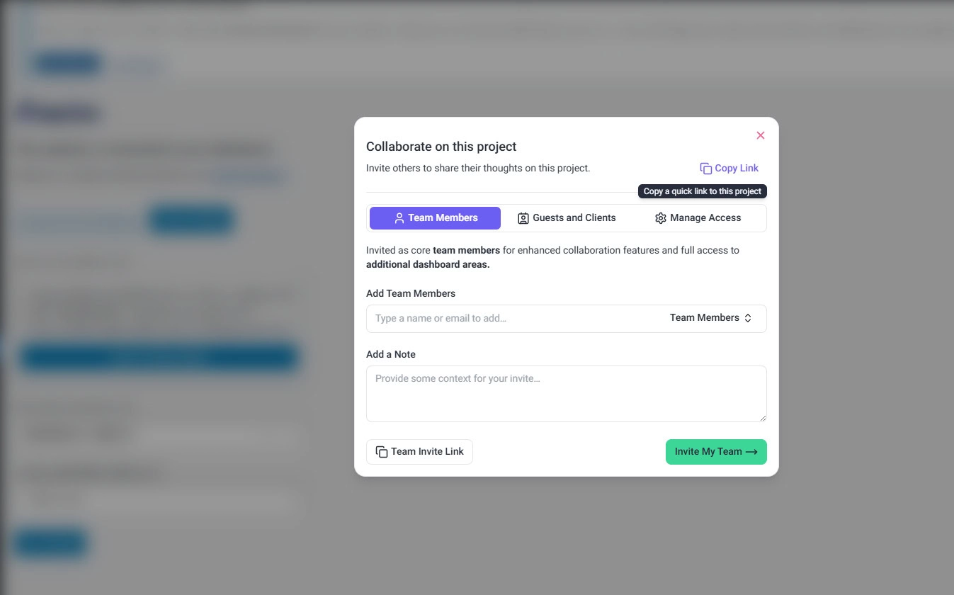 - Copy collaboration links, enable guest access, and share with clients or team members directly from the settings page.