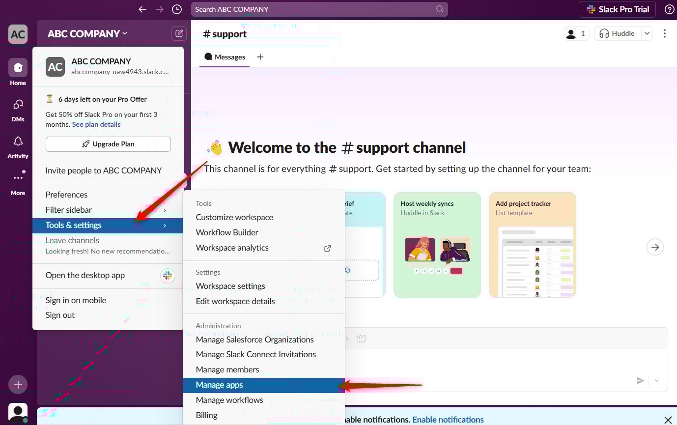 Open your Slack workspace and access the Tools menu.