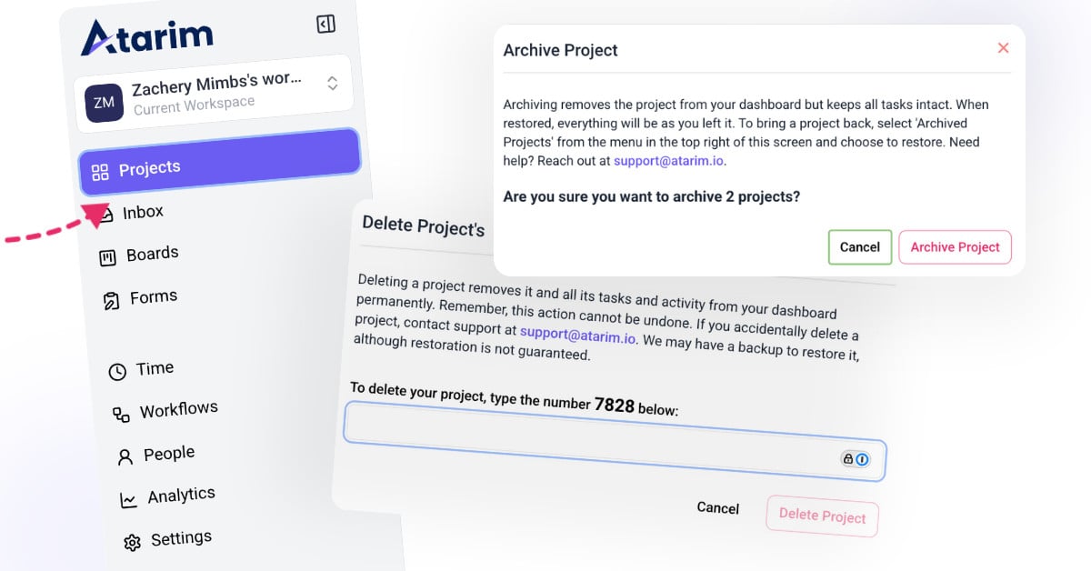 Managing dormant or completed projects effectively is crucial for maintaining a clutter-free workspace and optimizing project slots. Atarim offers tools for deleting projects, ensuring unwanted projects are permanently removed, and archiving projects, which retains data while keeping the workspace organized. This guide walks you through the best practices for managing projects based on your needs.