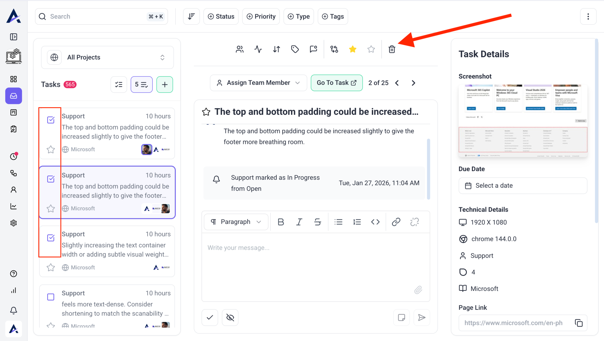- Change the status to Open, In Progress, Pending Review, or Completed.