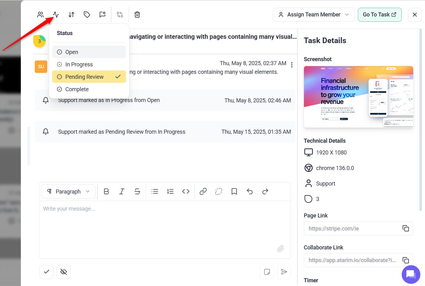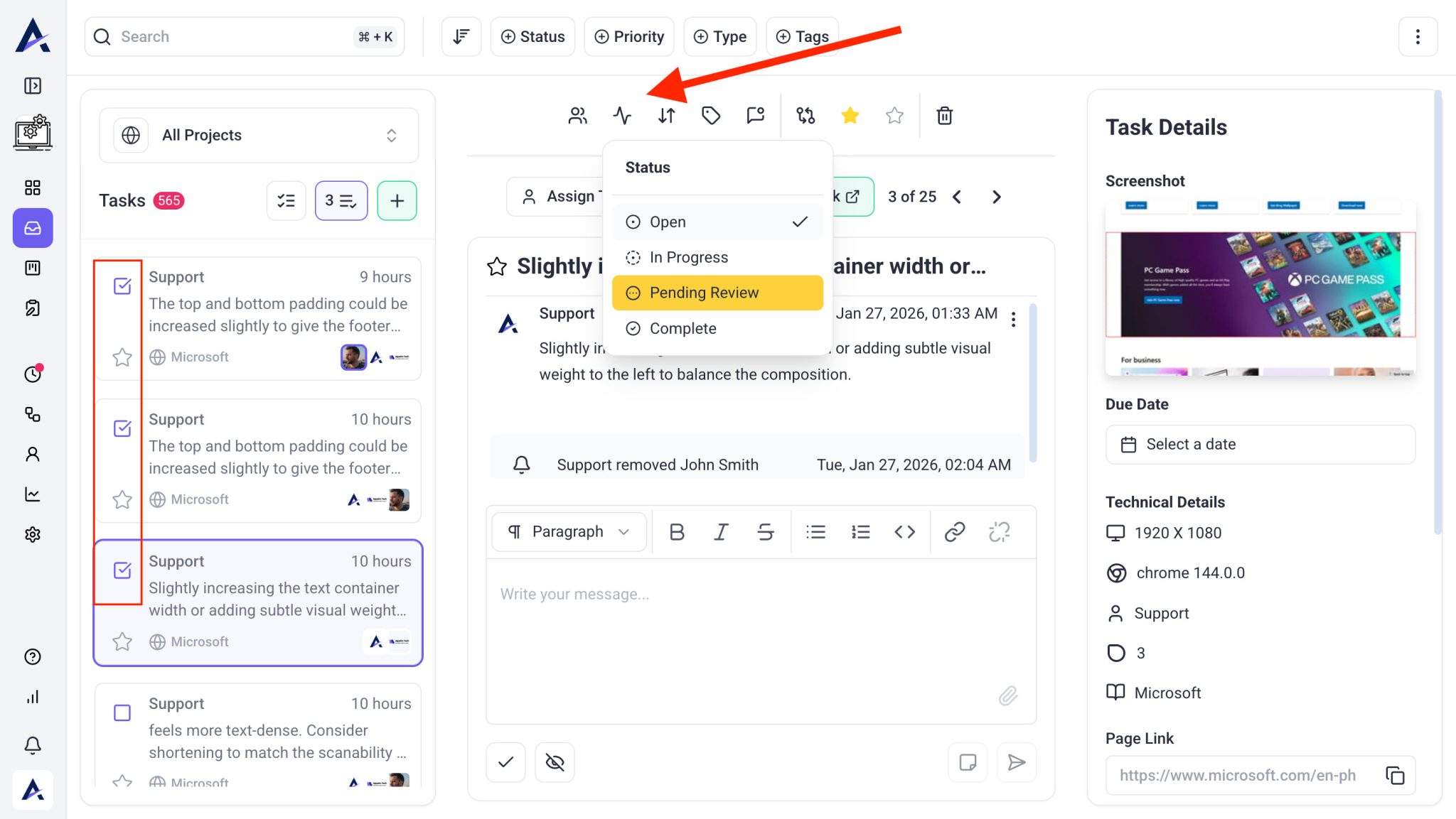 - Change the status to Open, In Progress, Pending Review, or Completed.
