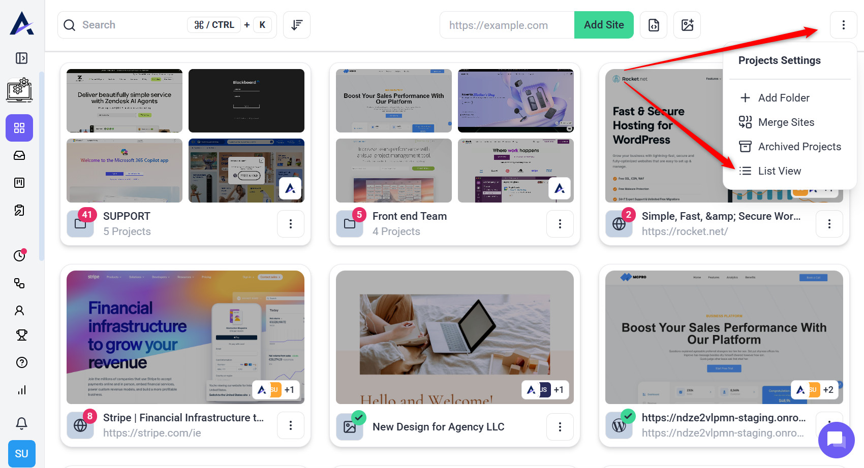 - Project Name and URL – Quick navigation to the site.
