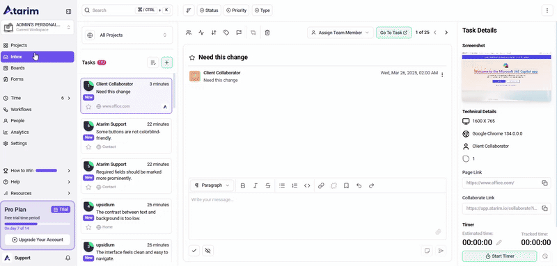 - An active workspace with assigned projects in Atarim.