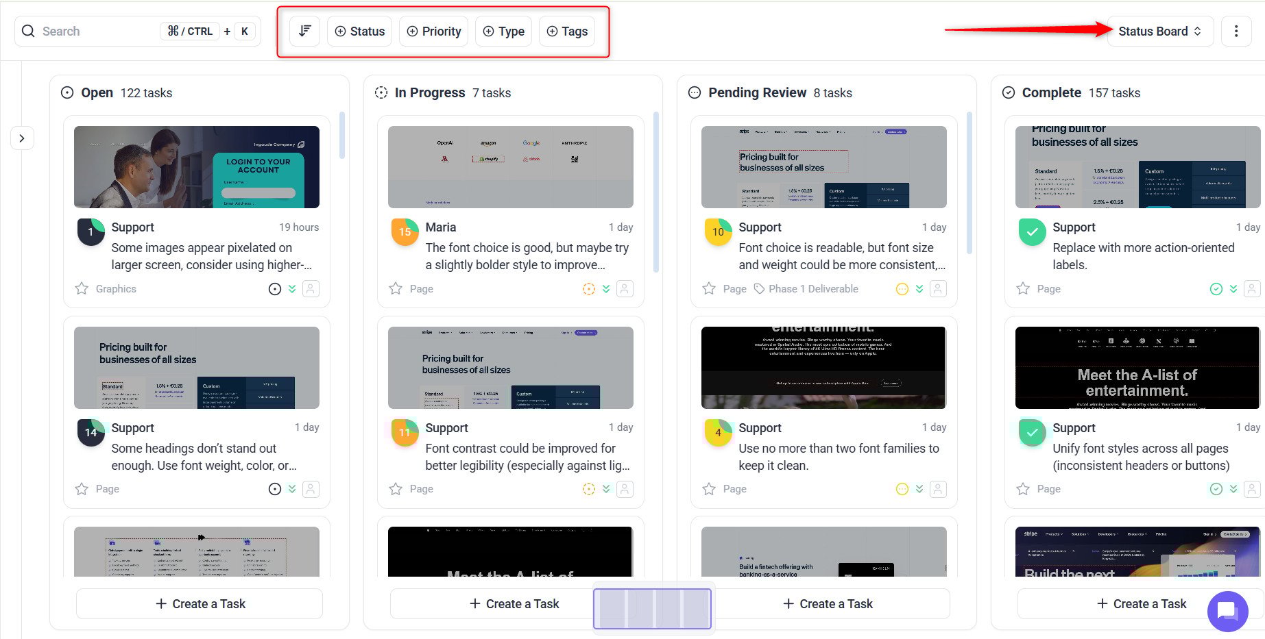 - What it does: View tasks by their current status: Open, In Progress, Pending Review, or Complete.