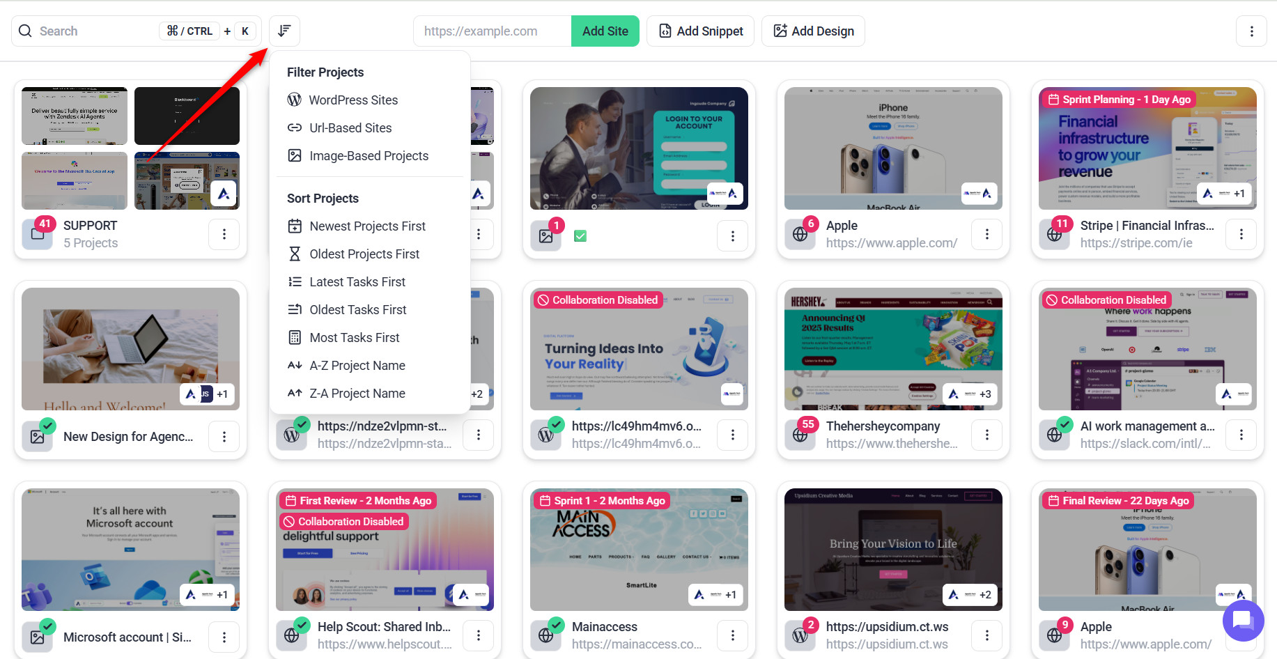 - What it does: Filters projects based on type (e.g., WordPress, URL-based, or design projects).