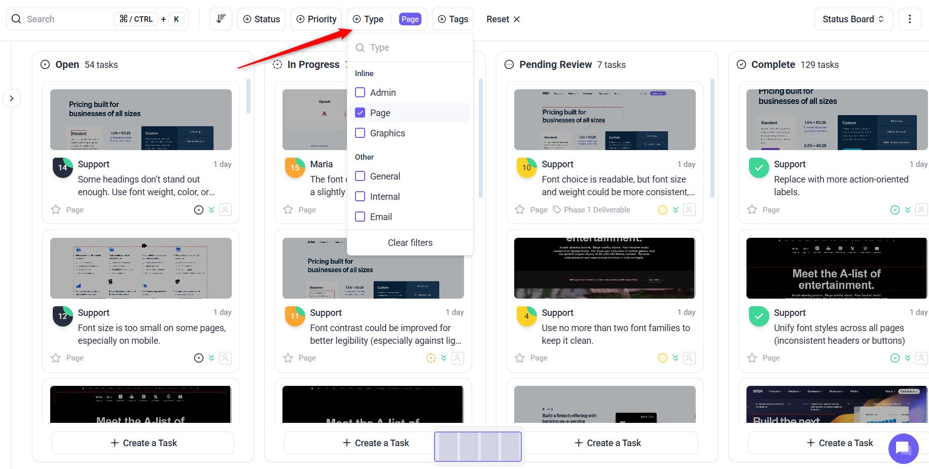 - A frontend developer can filter “Page” tasks to identify areas requiring immediate coding updates.