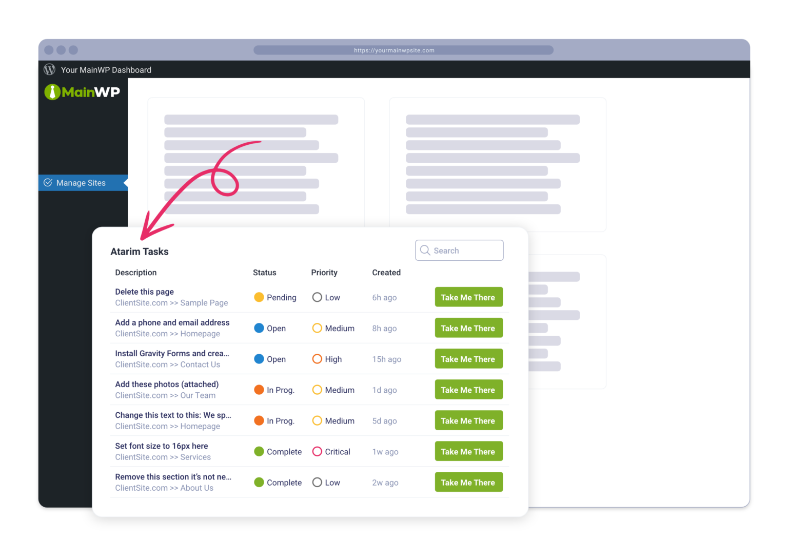 All tasks made via visual collaboration inside Atarim on your websites inside MainWP, will be neatly organized into a list on your MainWP Dashboard.